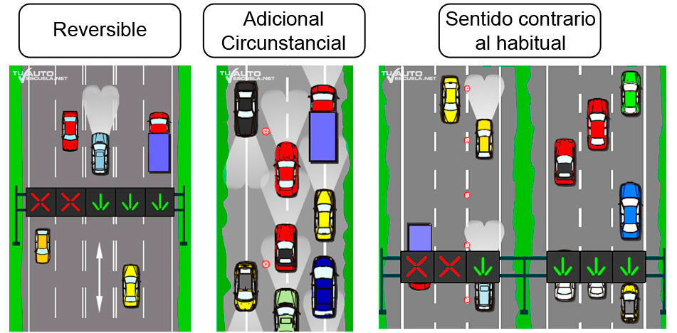 En las calzadas con doble sentido de circulación y arcenes, se podrá habilitar un carril adicional de circulación en uno de los sentidos de la marcha. Se añade un carril en el centro de la calzada y se permite circular utilizando los arcenes.