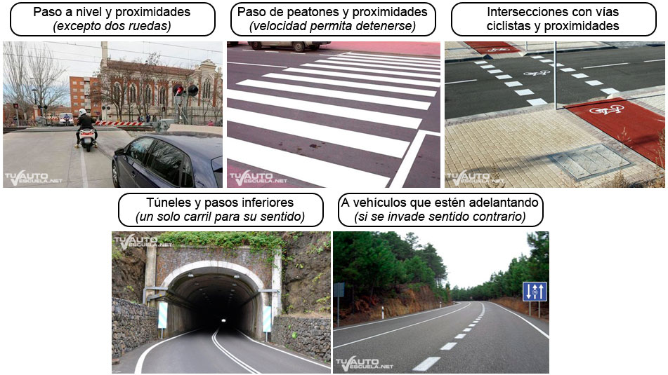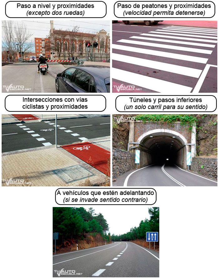 - Túneles, pasos inferiores y tramos con la señal túnel, si solo tienen un carril para su sentido de circulación.