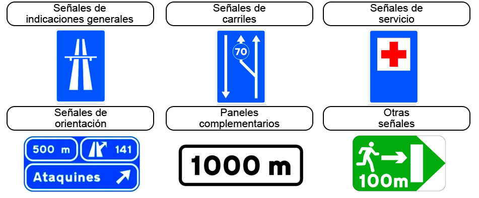 La finalidad de éstas es facilitar al usuario ciertas indicaciones de la vía que pueden serle de utilidad. Hay varias categorías: Las señales de indicación pueden ir junto a un panel comentario en su parte inferior, que indica la distancia entre la señal y el lugar señalado.