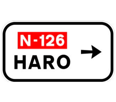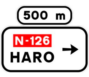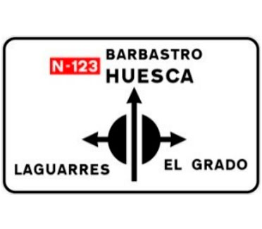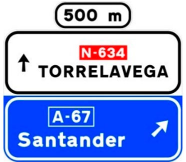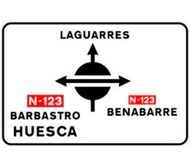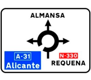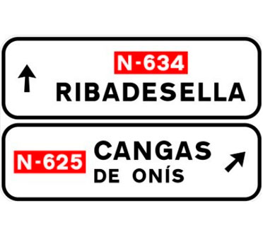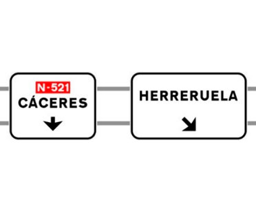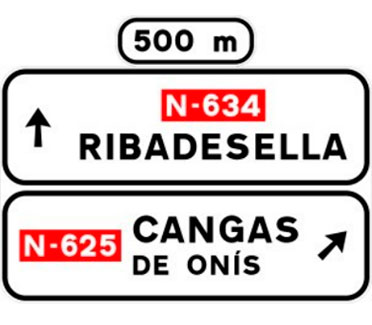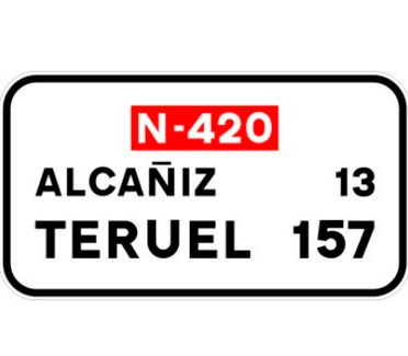 Indica, en una carretera convencional o una carretera multicarril, la dirección propia de la carretera por la que se circula y los destinos de la salida del próximo nudo cuando esta dirige hacia una autopista o una autovía.