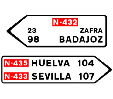 El cajetín situado dentro de la señal define la categoría y número de la carretera. Las cifras alineadas con los destinos indican la distancia existente a los mismos expresada en kilómetros.