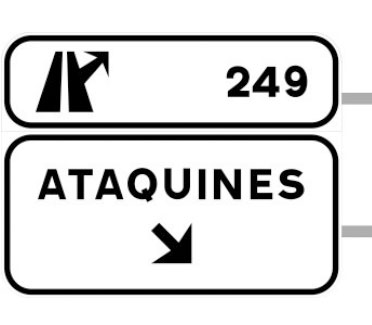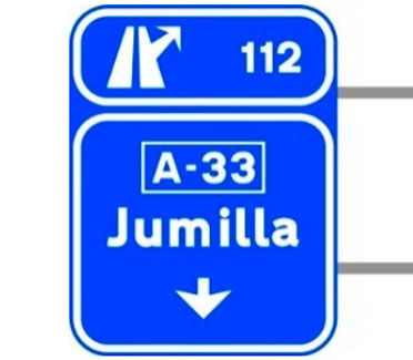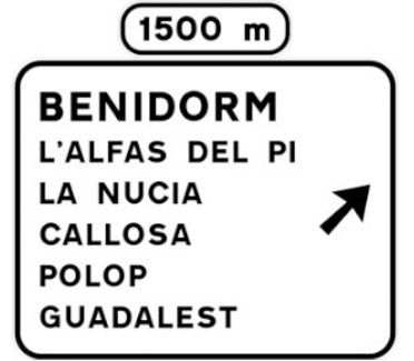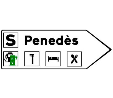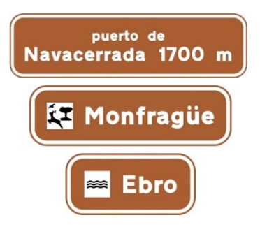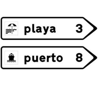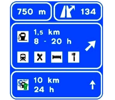 Indica lugares de interés que no son poblaciones situados en un itinerario constituido por una autopista o una autovía. Las cifras alineadas con los destinos indican la distancia existente a los mismos expresada en kilómetros.