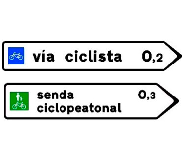 Indica la existencia en la dirección apuntada por la flecha de una vía ciclista o una senda ciclopeatonal. Las cifras alineadas con los destinos indican la distancia existente a los mismos expresada en kilómetros.