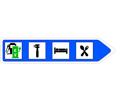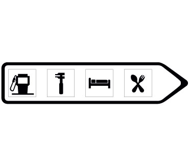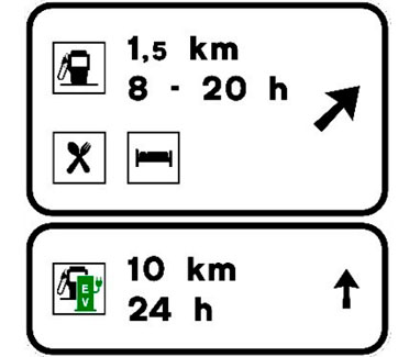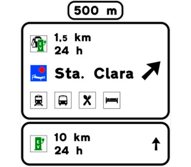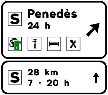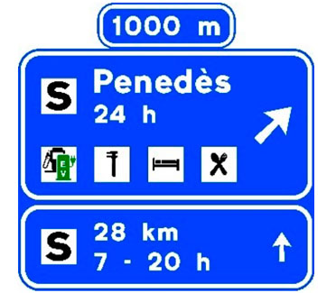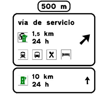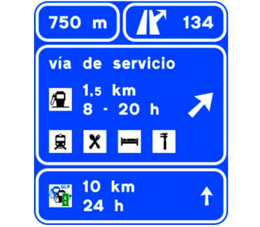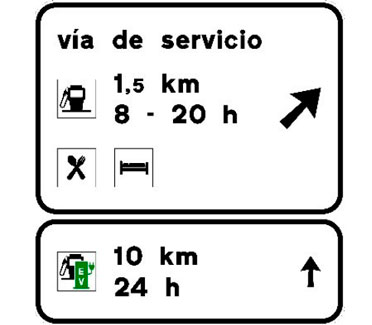 Indica en carreteras convencionales con tráfico elevado y en todas las carreteras multicarril, la proximidad de una salida hacia los servicios señalizados. Si estos se encuentran ubicados en una población, el nombre de la misma podrá figurar en la primera línea del cartel y si están emplazados en una vía de servicio figurará la inscripción “vía de servicio”. En caso de que entre los servicios exista una estación de servicio y/o una estación de recarga, se indicará la distancia hasta la misma así como su horario de apertura. En el subcartel inferior figurará la distancia y horario de apertura de la siguiente estación de servicio y/o estación de recarga en el sentido de la marcha. En el cajetín superior figurará la distancia a la salida.