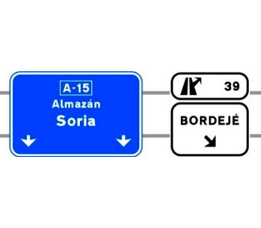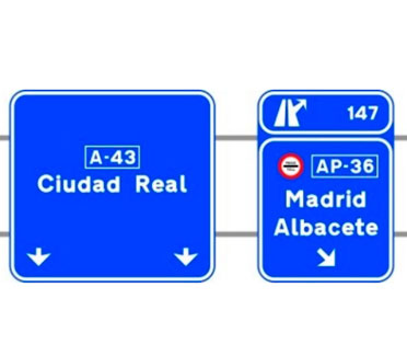 Indica, en una autopista o una autovía, la dirección propia de la carretera por la que se circula y las direcciones de los ramales de dos salidas consecutivas. También indica la distancia a dichas salidas, los números o el número y letras de cada una de ellas.