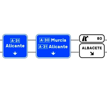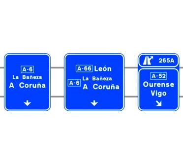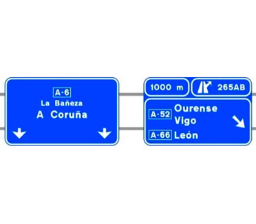 Indica las direcciones de los ramales de las dos salidas consecutivas en una autopista o una autovía. También indica la distancia a dichas salidas, los números o el número y letras de cada una de ellas.