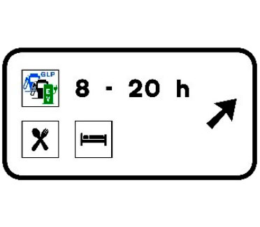 En el cajetín superior figurará la distancia a la salida. En el subcartel inferior figurará la distancia y el horario de apertura de la siguiente área de servicio en el sentido de la marcha.