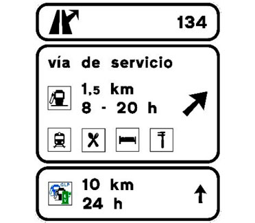 Indica, en una autopista o una autovía, la proximidad de una salida hacia los servicios señalizados. Si estos se encuentran ubicados en una población, el nombre de la misma podrá figurar en la primera línea del cartel y si están emplazados en una vía de servicio figurará la inscripción “vía de servicio”. En caso de que entre los servicios exista una estación de servicio y/o una estación de recarga, se indicará la distancia hasta la misma así como su horario de apertura. En el subcartel inferior figurará la distancia y horario de apertura de la siguiente estación de servicio y/o estación de recarga en el sentido de la marcha. En los subcarteles superiores figurará el número de salida y la distancia hasta esta.