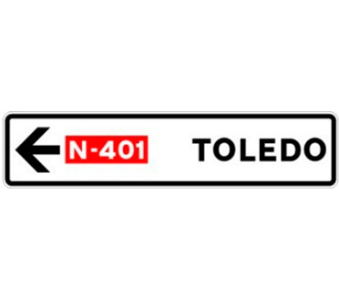 Indica, en una carretera convencional o una carretera multicarril, la dirección propia de la carretera por la que se circula y los destinos de la salida del próximo nudo cuando esta dirige hacia una carretera convencional o una carretera multicarril.