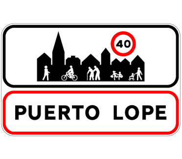 Indica el nombre de la población a la que se accede, así como el lugar a partir del cual rigen las normas de circulación en poblado. El subcartel superior refuerza el mensaje de que debe adaptarse la conducción ante la presencia de peatones, ciclistas u otras personas usuarias vulnerables. Además, podrá incluirse la velocidad máxima permitida en esa vía a partir de ese punto, con independencia de que en otras vías del poblado puedan existir límites diferentes.