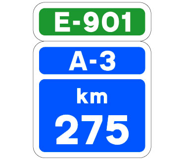 Indica el punto kilométrico cuando aquel es múltiplo de 10 en una autopista o una autovía perteneciente a un itinerario internacional, cuya identificación aparece en la parte superior de la señal.
