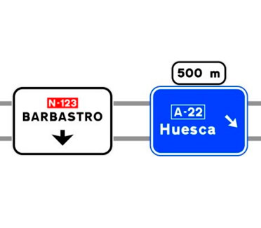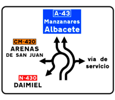 Indica, en una carretera convencional o una carretera multicarril, los destinos de las salidas del próximo nudo cuando estas dirigen hacia una autopista o una autovía, así como la distancia a la que se encuentran dichas salidas.