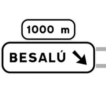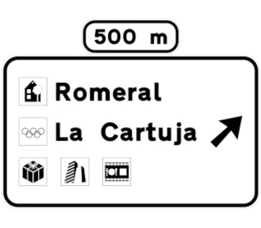 Indica, en una carretera convencional o una carretera multicarril, la dirección propia de la carretera por la que se circula y los destinos de la salida del próximo nudo cuando esta dirige hacia una carretera convencional o una carretera multicarril, así como la distancia a la que se encuentra dicha salida.