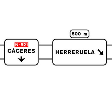 Indica, en una carretera convencional o una carretera multicarril, los destinos de las salidas del próximo nudo cuando estas dirigen hacia una carretera convencional o una carretera multicarril, así como la distancia a la que se encuentran dichas salidas.