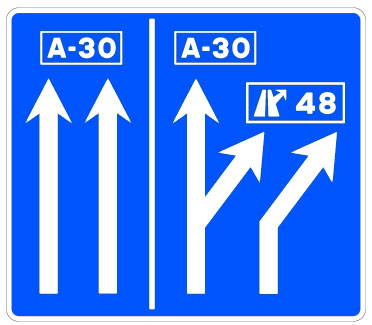 Indica las únicas direcciones permitidas en el próximo nudo a los usuarios que circulan por los carriles señalizados. Sobre las flechas que indican los carriles de permanencia en la carretera por la que se circula se dispondrá el cajetín indicativo de la misma. Se limitará su uso a situaciones excepcionales donde la línea continua de separación de carriles no implique la divergencia respecto de los carriles situados a la izquierda, o a enlaces o bifurcaciones entre dos autovías o autopistas con alta intensidad de tráfico en ambas.