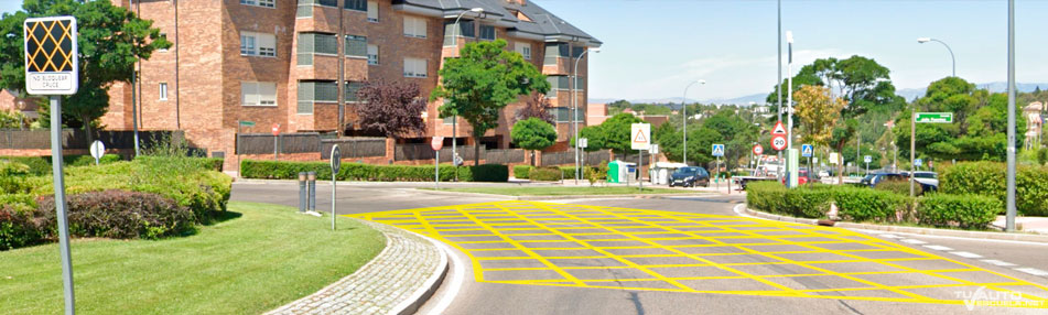 Un conjunto de líneas amarillas entrecruzadas recuerda a los conductores la prohibición de entrar en la intersección cuando previsiblemente puedan quedarse detenido de forma que impida u obstruya la circulación transversal.