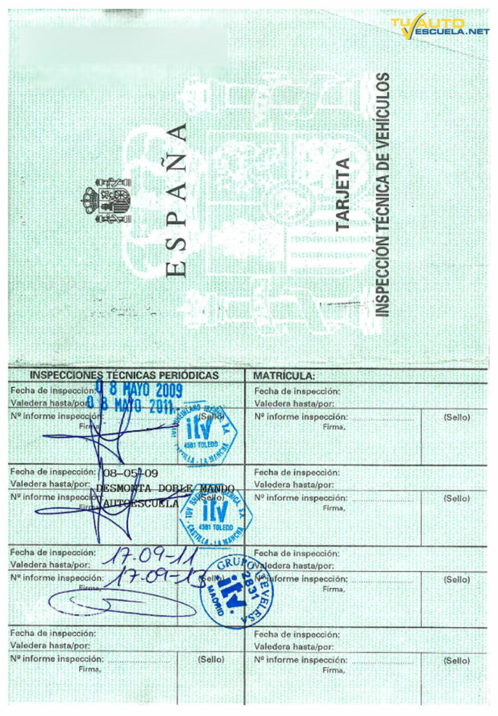 - Reverso: Características técnicas del vehículo (número de bastidor, marca, tipo, tara, número de asientos, potencia, masa máxima remolcable, etc), así como las reformas de importancia realizadas (enganche remolque, faros adicionales…)