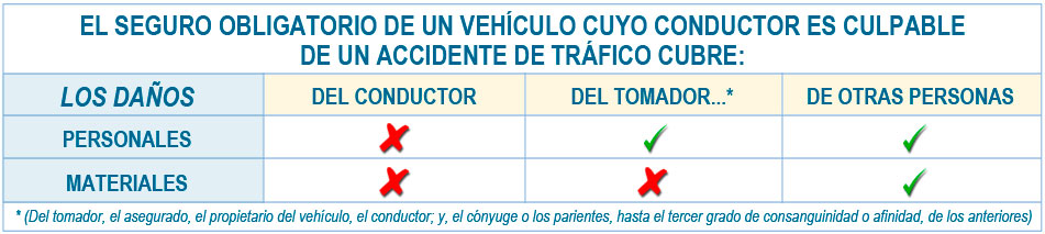 El seguro obligatorio de un vehículo cuyo conductor es culpable de un accidente de tráfico cubre: